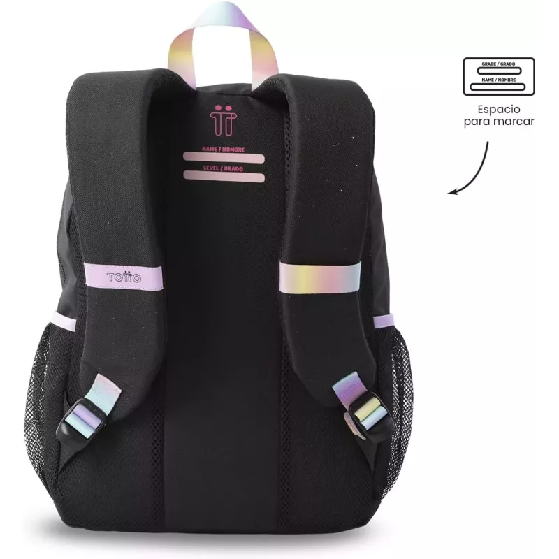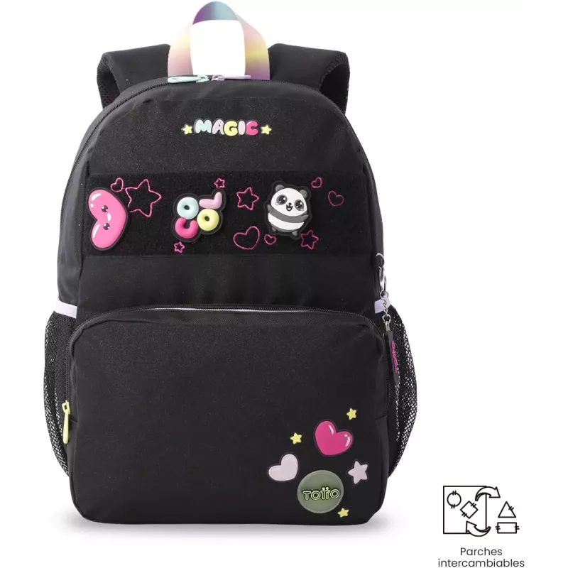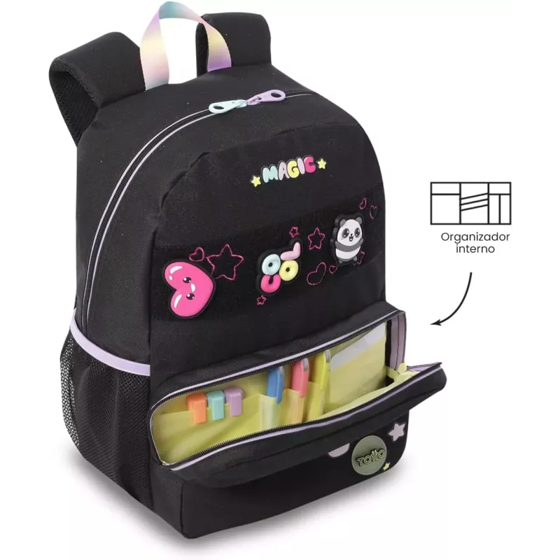 - Diseño Juvenil: La Mochila Escolar Totto Glowing Black presenta un diseño moderno y juvenil que se adapta a las tendencias actuales, permitiendo a los estudiantes expresar su estilo personal.