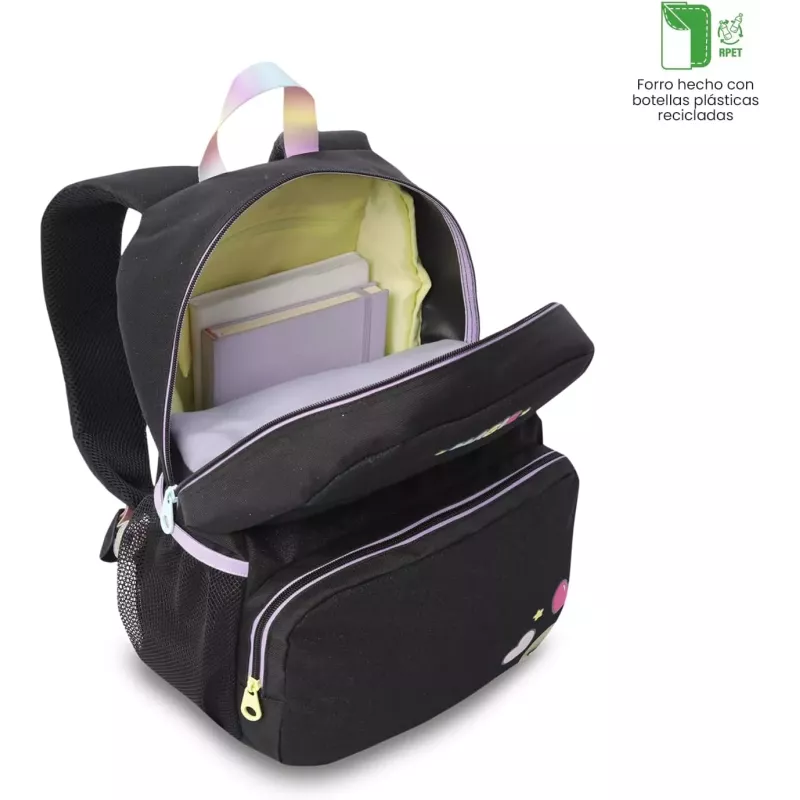 Con un elegante color negro y detalles que brillan en la oscuridad, esta mochila se convierte en un accesorio imprescindible para destacar en cualquier entorno escolar. Su tamaño mediano es ideal para llevar todos los útiles escolares necesarios sin comprometer el espacio ni la comodidad.